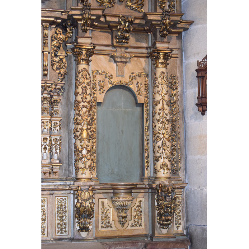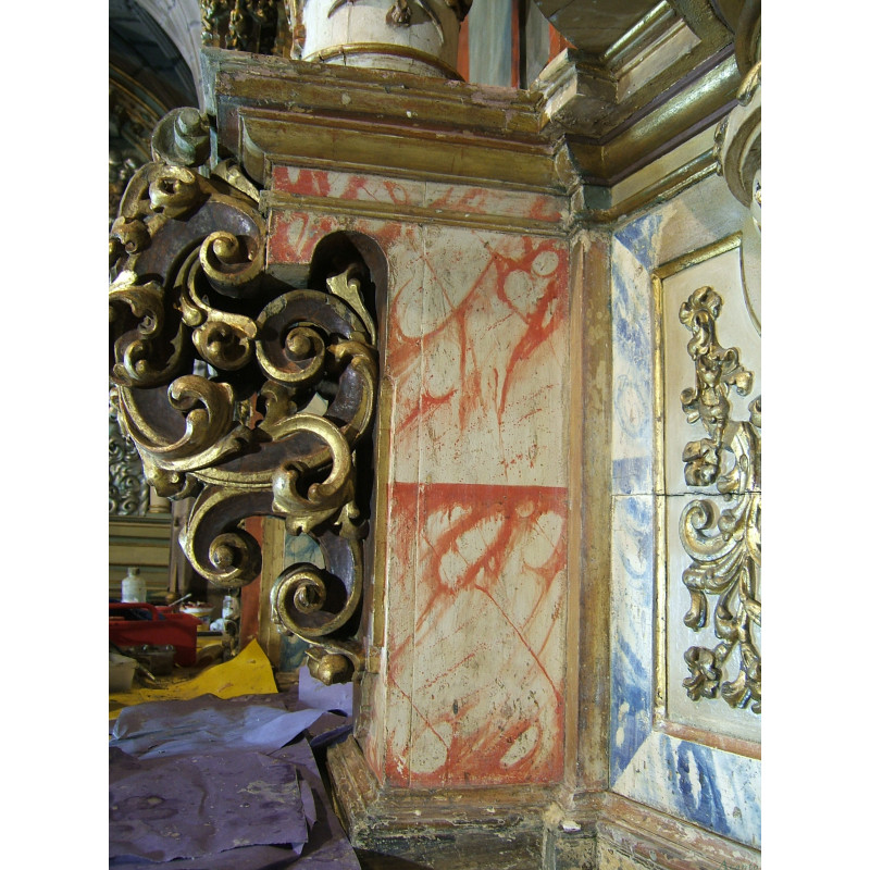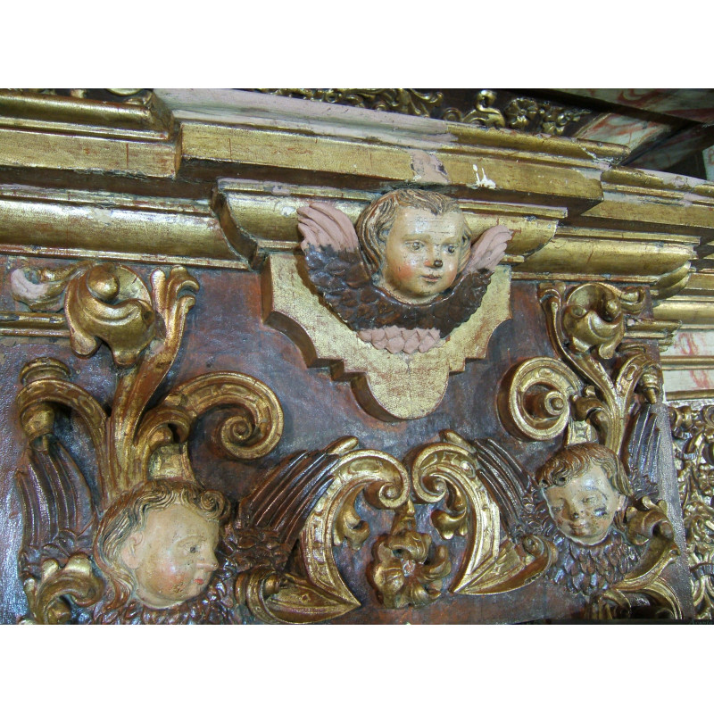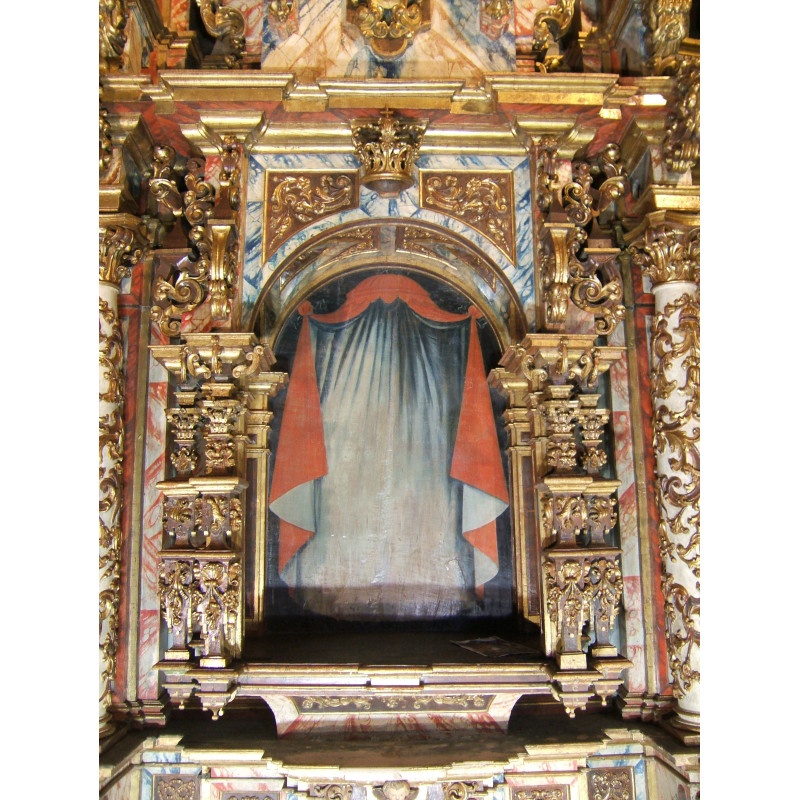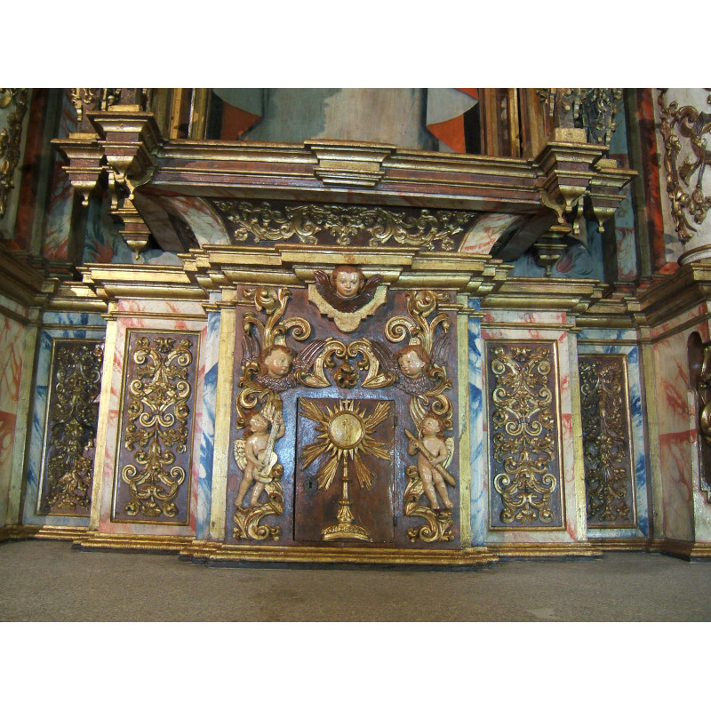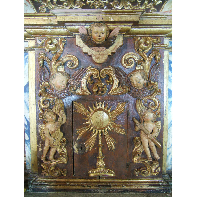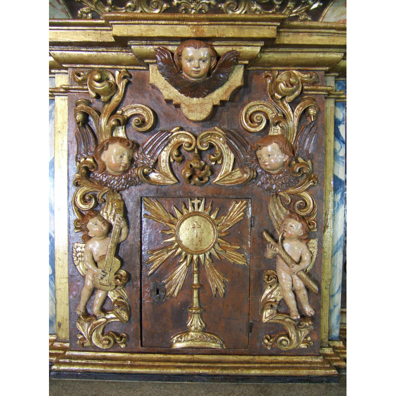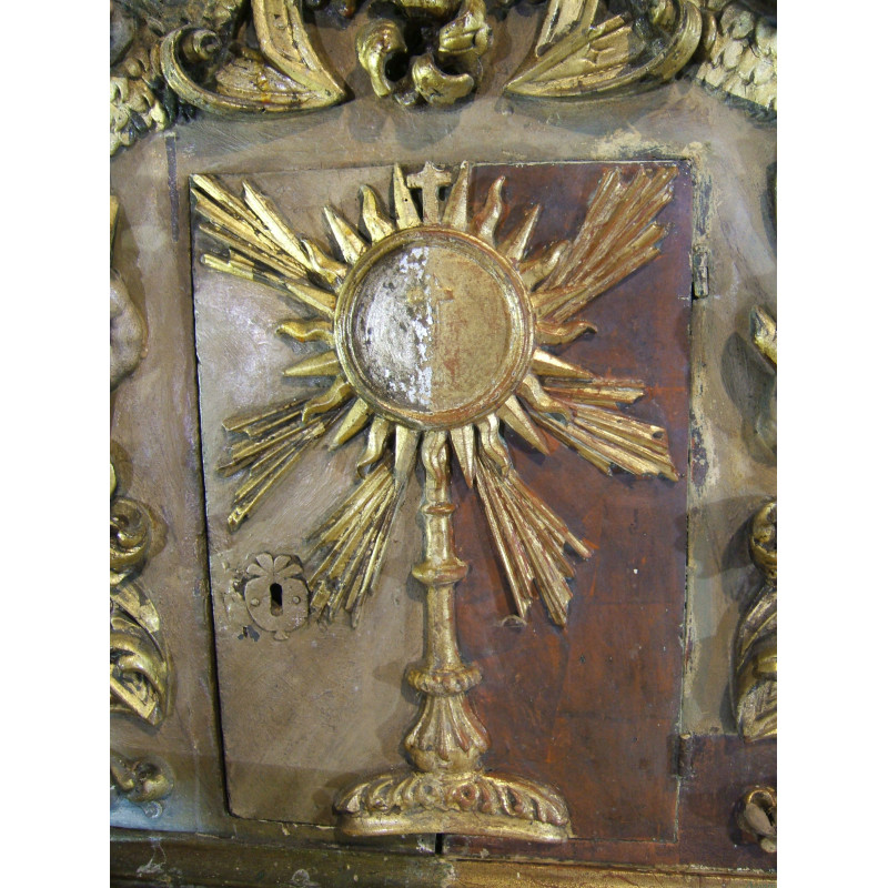 Estado de conservación era malo. Ataque puntual de insectos xilófagos (carcoma) visible en la zona superior del sagrario. Pérdida puntual de masa lígnea. Estructura se muestra estable. Anclajes no son visibles. Hundimiento e inclinación en el templete de la Virgen. Pérdidas de volumen puntuales, coincidiendo con zonas bajas. Seguramente por golpes de carácter mecánico. Separaciones entre piezas y aparición de grietas. Clavos oxidados. Al menos una intervención anterior. Repintado y redorado total de la obra, con una preparación intermedia. Repolicromado con grises, cremas, marmoleados en beige y rosas. Redorado con oro falso al mixtión. Oxidaciones puntuales. Policromía original rica y de colores vivos. Dorado original con oro fino al agua. Mesado original (seguramente de madera) sustituido por uno de piedra granito. Descomposición de los estucos. Desprendimientos de película pictórica. Levantamientos y desprendimientos de la película pictórica. Oxidación de la capa protectora. Manchas de humedad y moho. Suciedad superficial.