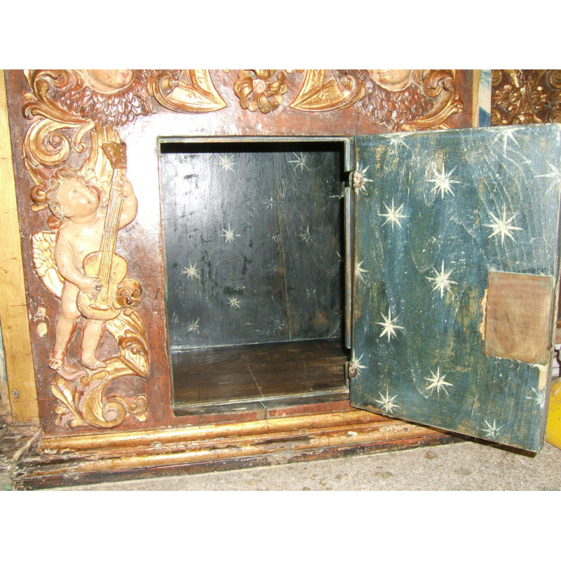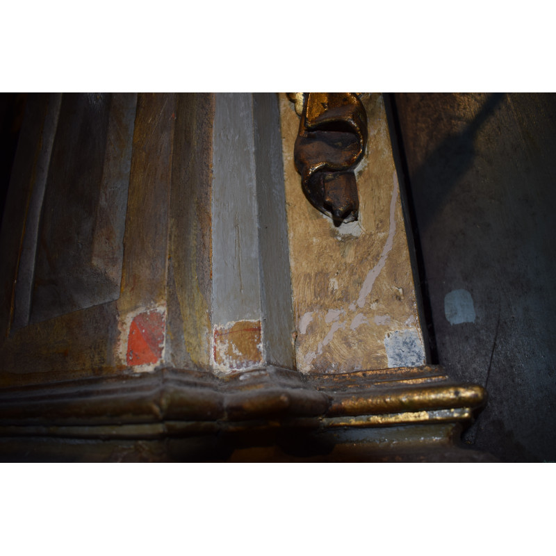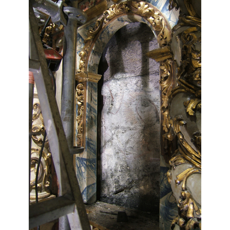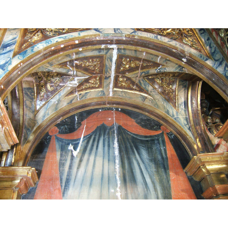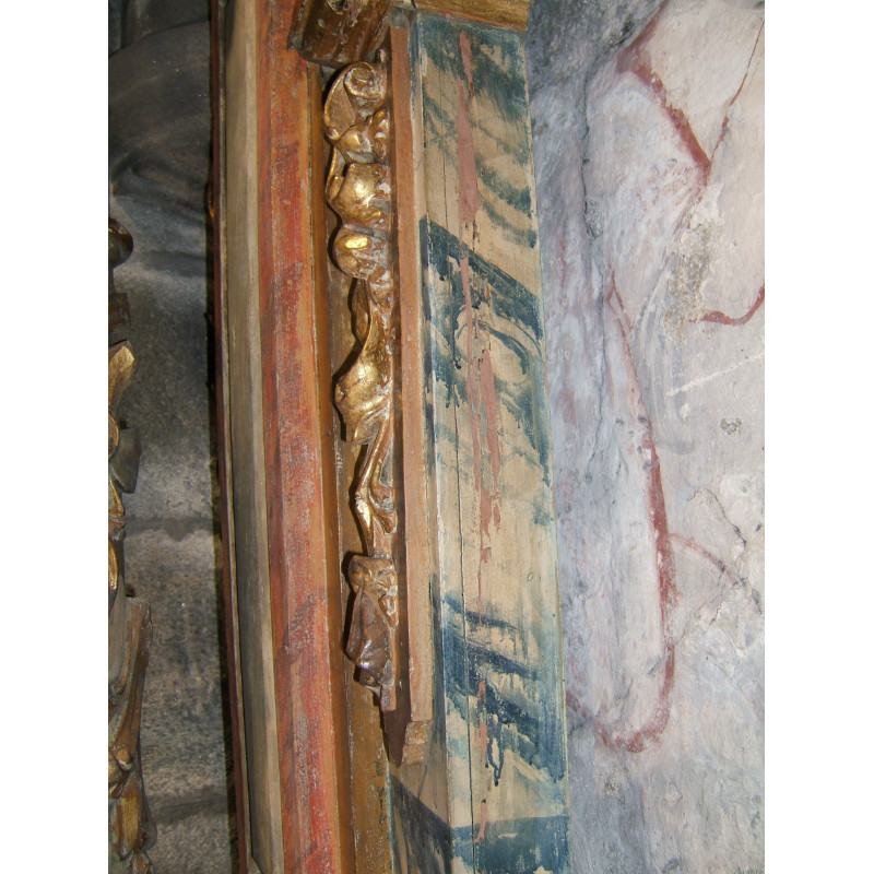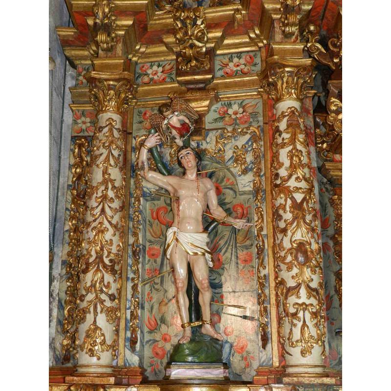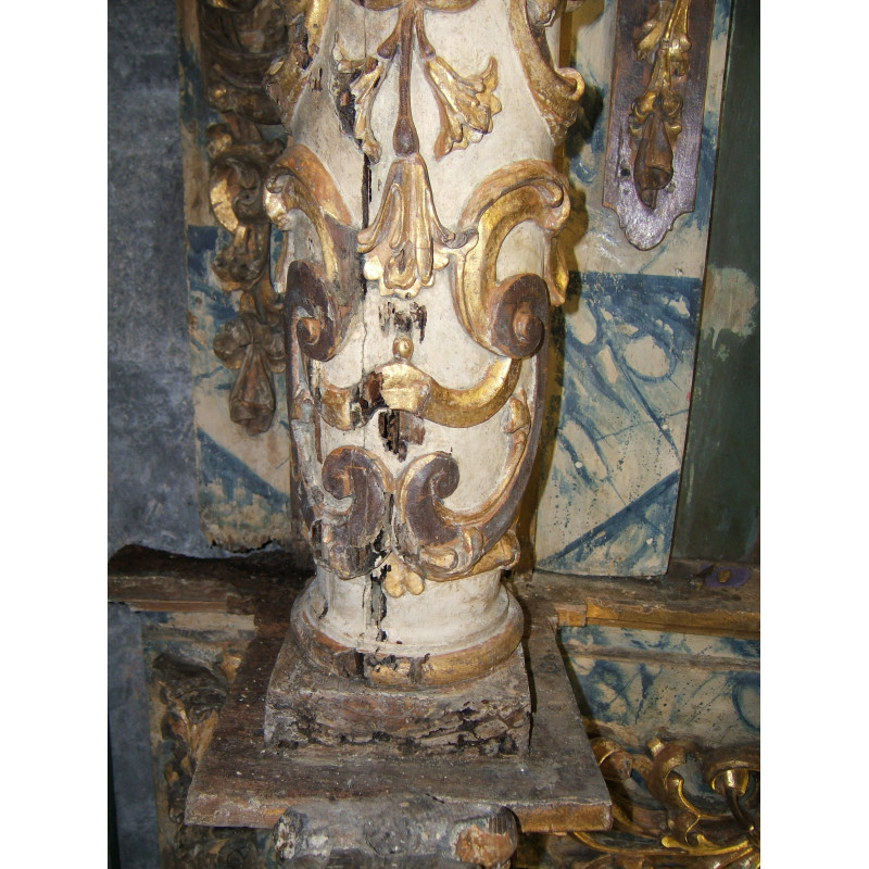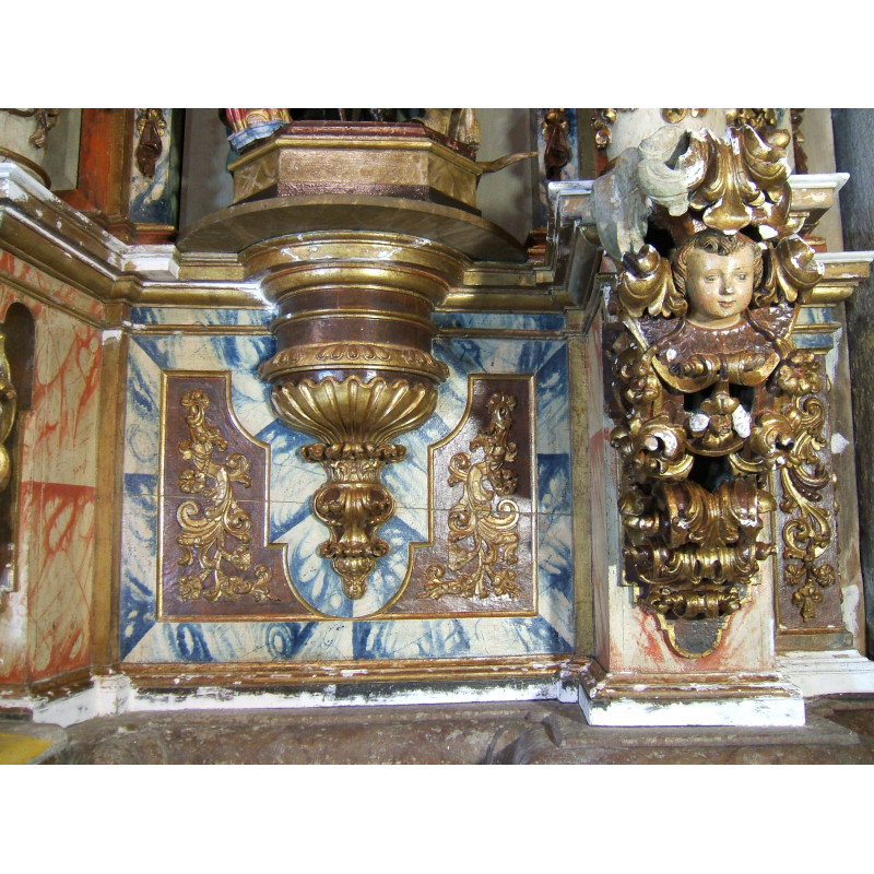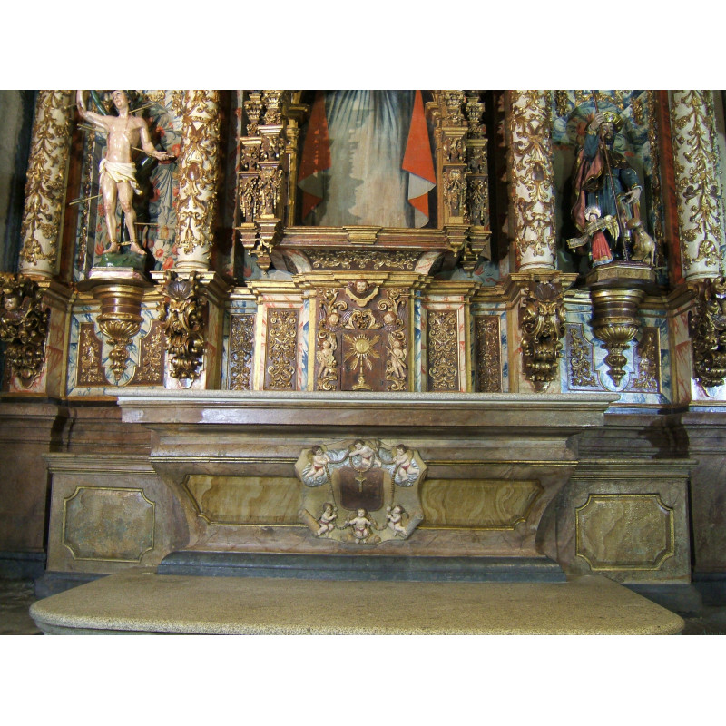 Estado de conservación era malo. Ataque puntual de insectos xilófagos (carcoma) visible en la zona superior del sagrario. Pérdida puntual de masa lígnea. Estructura se muestra estable. Anclajes no son visibles. Hundimiento e inclinación en el templete de la Virgen. Pérdidas de volumen puntuales, coincidiendo con zonas bajas. Seguramente por golpes de carácter mecánico. Separaciones entre piezas y aparición de grietas. Clavos oxidados. Al menos una intervención anterior. Repintado y redorado total de la obra, con una preparación intermedia. Repolicromado con grises, cremas, marmoleados en beige y rosas. Redorado con oro falso al mixtión. Oxidaciones puntuales. Policromía original rica y de colores vivos. Dorado original con oro fino al agua. Mesado original (seguramente de madera) sustituido por uno de piedra granito. Descomposición de los estucos. Desprendimientos de película pictórica. Levantamientos y desprendimientos de la película pictórica. Oxidación de la capa protectora. Manchas de humedad y moho. Suciedad superficial.