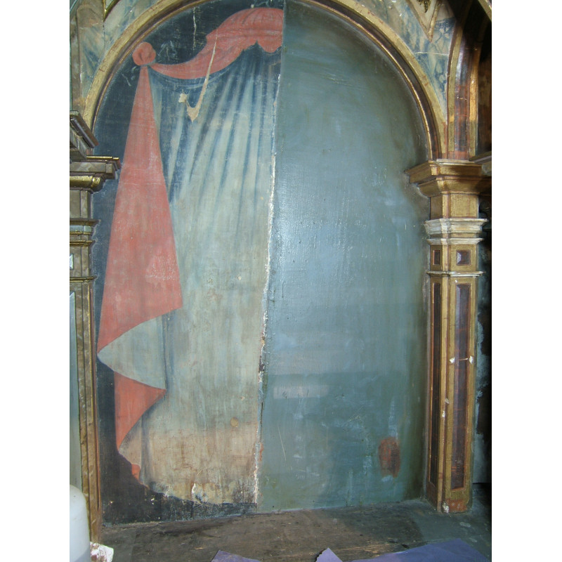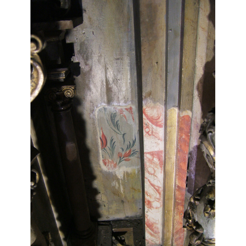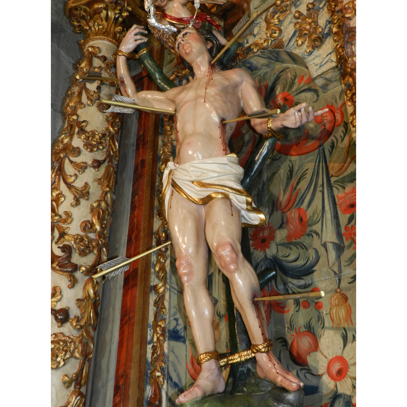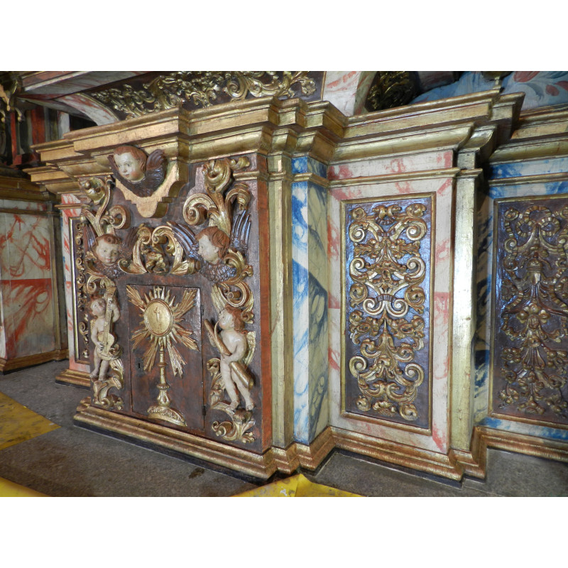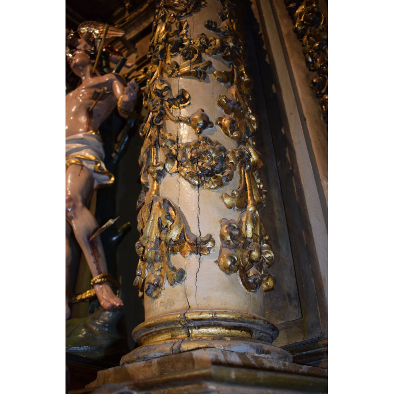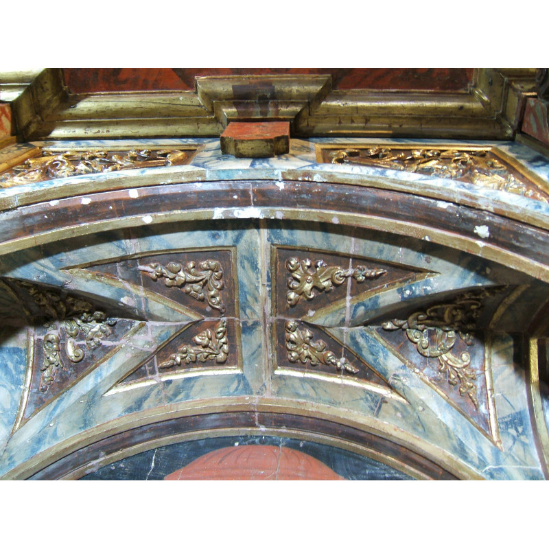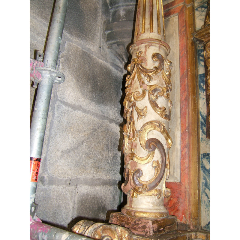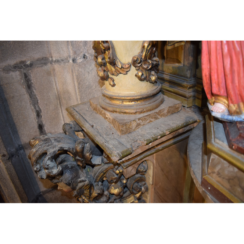 Estado de conservación era malo. Ataque puntual de insectos xilófagos (carcoma) visible en la zona superior del sagrario. Pérdida puntual de masa lígnea. Estructura se muestra estable. Anclajes no son visibles. Hundimiento e inclinación en el templete de la Virgen. Pérdidas de volumen puntuales, coincidiendo con zonas bajas. Seguramente por golpes de carácter mecánico. Separaciones entre piezas y aparición de grietas. Clavos oxidados. Al menos una intervención anterior. Repintado y redorado total de la obra, con una preparación intermedia. Repolicromado con grises, cremas, marmoleados en beige y rosas. Redorado con oro falso al mixtión. Oxidaciones puntuales. Policromía original rica y de colores vivos. Dorado original con oro fino al agua. Mesado original (seguramente de madera) sustituido por uno de piedra granito. Descomposición de los estucos. Desprendimientos de película pictórica. Levantamientos y desprendimientos de la película pictórica. Oxidación de la capa protectora. Manchas de humedad y moho. Suciedad superficial.